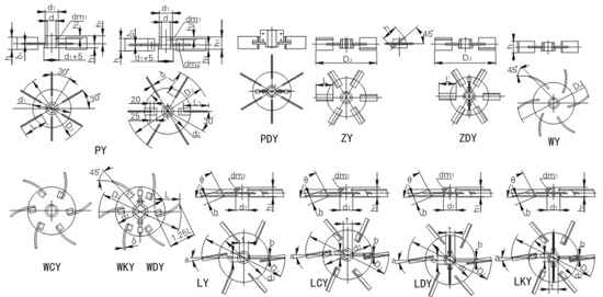 平直葉圓盤渦輪式-PY、平直葉對開圓盤渦輪式-PDY、斜葉圓盤渦輪式-ZY、斜葉對開圓盤渦輪式-ZDY、彎葉圓盤渦輪式-WY、彎葉可拆圓盤渦輪式-WCY、彎葉對開圓盤渦輪式-WDY、彎葉可拆對開圓盤渦輪式-WKY、螺距葉圓盤渦輪-LY、螺距葉可拆圓盤渦輪式-LCY、螺距葉對開圓盤渦輪式-LDY、螺距葉可拆對開圓盤渦輪式-LKY